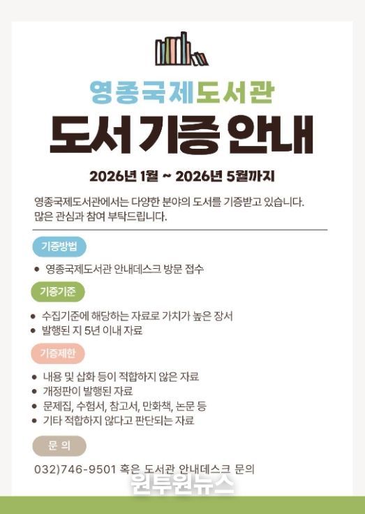 (원투원뉴스) 인천시 중구는 ‘주민과 함께 만드는 열린 도서관’ 실현 차원에서 올해 1월부터 ‘영종국제도서관 도서 기증 캠페인’을 추진하며, 주민들의 적극적인 관심과 참여를 당부했다고 29일 밝혔다.
