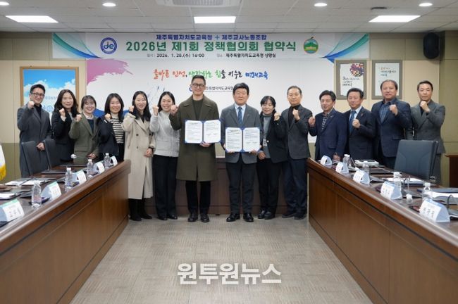 (원투원뉴스) 제주특별자치도교육청과 제주교사노동조합은 학교 현장에서의 근무 여건 개선과 전문성 향상을 위한 6개 분야 정책과제에 대해 28일 도교육청 2층 상황실에서 정책협의회를 갖고 최종 합의했다.