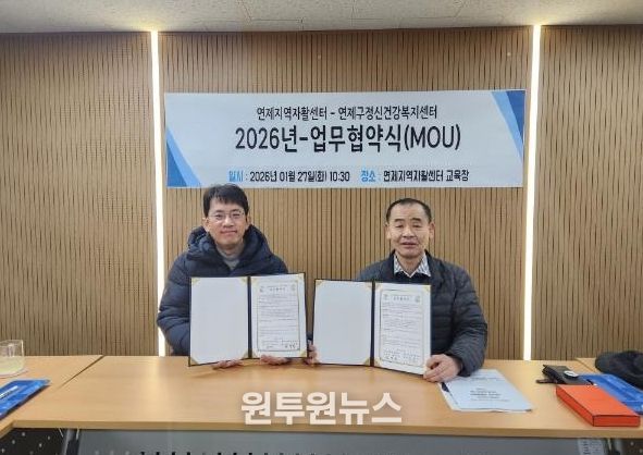 (원투원뉴스) 연제지역자활센터(센터장 정덕용)는 1월 27일 연제구정신건강복지센터(센터장 설장우)와 자활근로 참여자나 종사자를 대상으로 다양한 복지서비스 제공을 위한 상호 업무협약(MOU)을 체결했다.