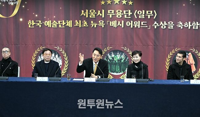 (원투원뉴스) 오세훈 서울시장은 문화예술계 인사들과 29일 12시, 서울시청 간담회장1에서 종묘제례악을 재해석한 ‘일무’로 2026년 ‘베시 어워드’에서 최우수 안무가·창작자상을 수상한 서울시무용단을 만나 축하 인사를 전했다.