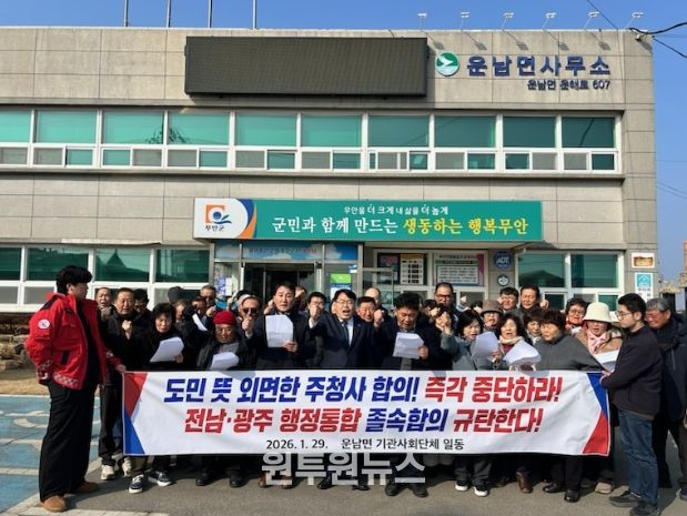 (원투원뉴스) 무안군 각 읍면 기관사회단체협의회는 29일 전남·광주 행정통합 추진과 관련해 최근 합의 내용에 대한 규탄 성명서를 발표했다.