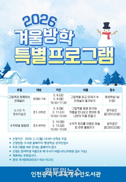 (원투원뉴스) 인천광역시교육청주안도서관은 관내 유·초등학생에게 다양한 평생학습 기회를 제공하기 위해 2월 6일부터 13일까지 ‘겨울방학 특별프로그램’을 운영한다.