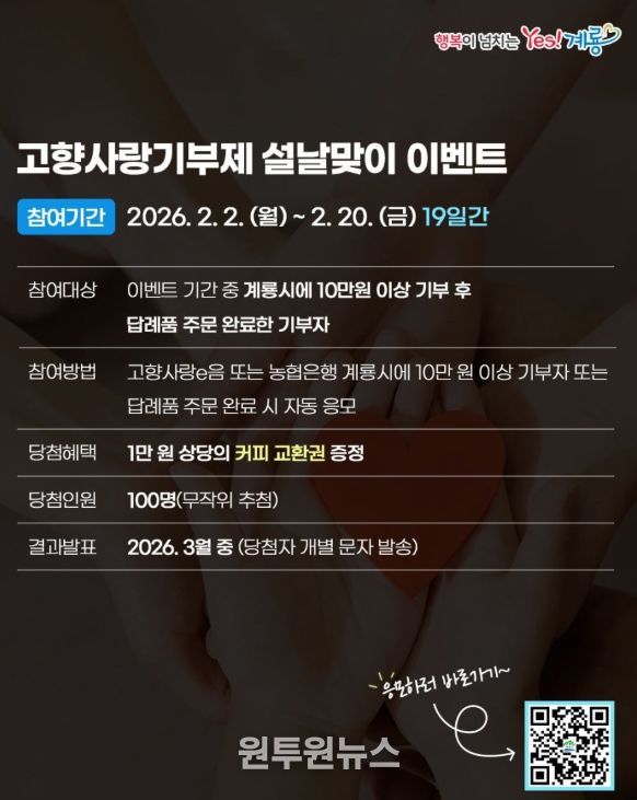 시 관계자는 “설 명절을 맞아 고향을 응원하는 마음을 기부로 표현할 수 있도록 이번 이벤트를 마련했다”며 “더 많은 분들이 고향사랑기부제에 참여해 계룡시 발전에 힘을 보태주길 기대한다”고 말했다.