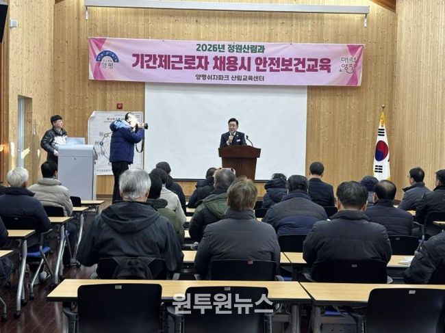(원투원뉴스) 양평군은 지난 29일 쉬자파크 산림교육센터에서 2026년 정원산림과 기간제근로자로 신규 채용된 근로자 55명을 대상으로 ‘산업안전보건법’에 따른 산업안전·보건 교육을 실시했다.