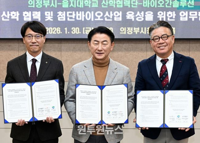 의정부시는 1월 30일 시청 회룡홀에서 을지대학교 산학협력단(단장 김인식), ㈜바이오간솔루션(대표 송명석)과 ‘지산학 협력 및 첨단 바이오산업 육성을 위한 업무협약’을 체결했다.