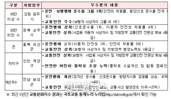 ’25년 교통문화지수 조사 결과, 강원 원주시(91.58점, 인구 30만 이상 시), 경북 상주시(87.62점, 인구 30만 미만 시), 충북 괴산군(88.72점, 군 지역), 인천 계양구(89.56점, 자치구)가 각각 1위로 선정됐다.