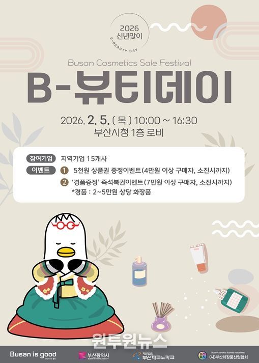 (원투원뉴스) 부산시는 오는 2월 5일 오전 10시부터 오후 4시 30분까지 시청 1층(대강당-대회의실 앞)에서 '2026 설맞이 비(B)-뷰티 데이'를 개최한다고 오늘(2일) 밝혔다.