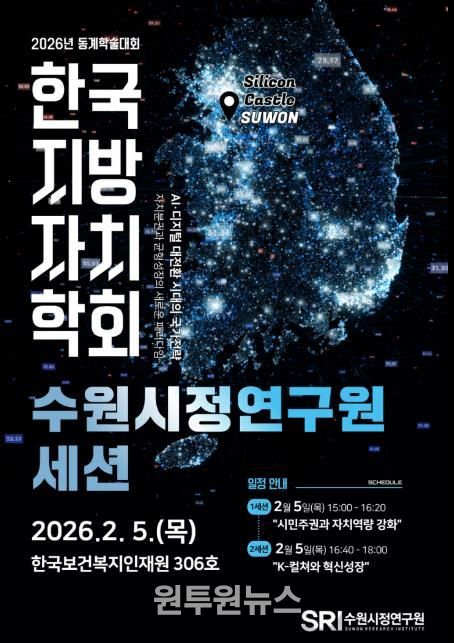 (원투원뉴스) 수원시정연구원은 오는 2월 5일(목) 충북 청주 오송 한국보건복지인재원에서 열리는 2026년 한국지방자치학회 동계학술대회에서 수원시의 대표 혁신 정책과 미래 성장 전략을 주제로 한 세션을 개최한다고 2월 2일 밝혔다.