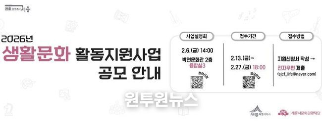 (원투원뉴스) 세종시문화관광재단은 일상 속 시민 주도 생활문화 확산과 지역공동체 의식 강화를 위해 2026년 생활문화 활동지원사업 공모를 진행한다.