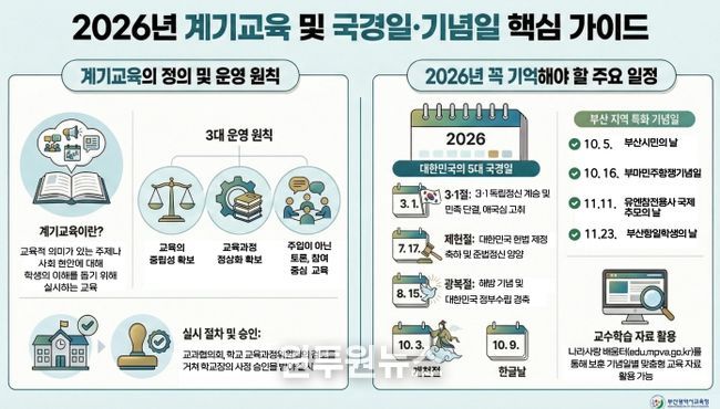 이번 홍보 강화는 시기별로 교육적 의미가 있는 주제를 다루는 ‘계기교육’의 현장 활용도를 높여, 학생들이 부산의 주요 기념일을 이해하고 그 역사적 의미를 자연스럽게 인식할 수 있도록 하기 위한 것이다.