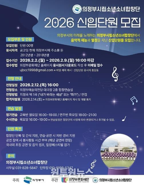 전형은 2월 12일 의정부예술의전당 2층 연습실에서 실시되며, 응시자는 지정곡인 ‘내가 바라는 세상’과 ‘화가’ 중 1곡을 선택해 가창하면 된다. 최종 합격자는 2월 14일 의정부문화재단 누리집과 개별 통지를 통해 발표할 예정이다.