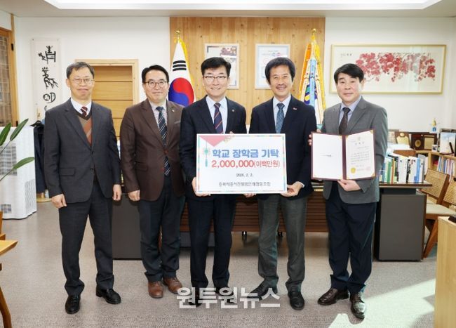 (원투원뉴스) 충청북도교육청은 충북세종사진앨범인쇄협동조합(이사장 장광동)으로부터 장학금 200만 원을 전달받고 교육감실에서 전달식을 가졌다.