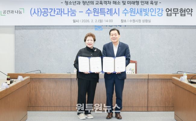 수원시와 (사)공간과나눔은 2일 시청 상황실에서 수원새빛인강 업무협약을 체결하고, 협력을 약속했다.