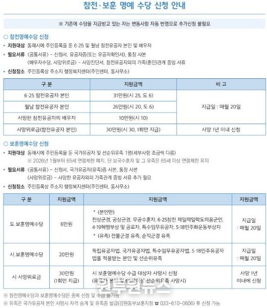 또한 보훈명예수당의 경우 보국수훈자 및 그 유족을 제외하고 적용되던 기존 65세 이상의 연령 제한을 2026년 1월부터 폐지해 보다 폭넓은 지원이 이뤄질 수 있도록 했다.