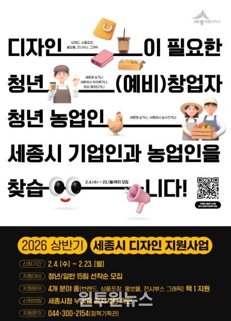 (원투원뉴스) 세종특별자치시가 4일부터 오는 23일까지 지역 기업의 맞춤형 디자인 개발을 돕는 ‘2026년 상반기 세종시 디자인 지원사업’ 참여 기업을 모집한다고 밝혔다.