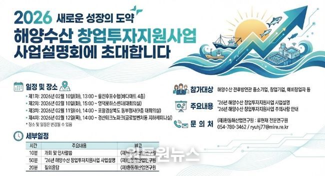 (원투원뉴스) 경상북도는 경북 지역의 해양수산 전․후방 관련 산업 중소기업 지원을 위한‘2026년 해양수산 창업·투자지원사업’의 참여 홍보와 지원 프로그램 소개를 위한 “찾아가는 사업설명회”를 개최한다고 밝혔다.