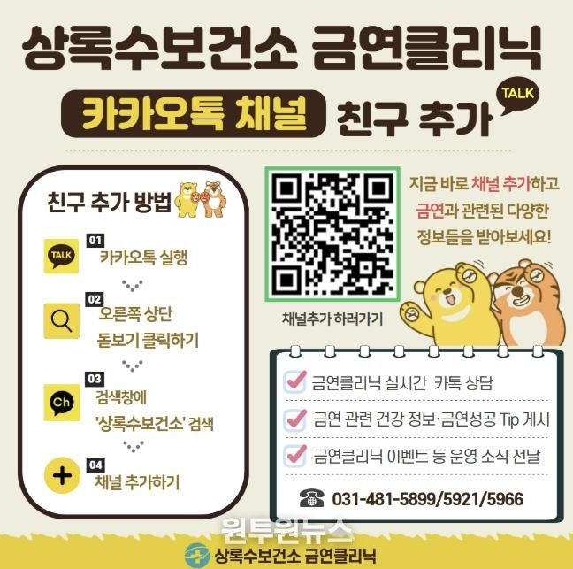 (원투원뉴스) 안산시 상록수보건소는 흡연자의 금연 성공을 체계적으로 지원하기 위해 ‘금연클리닉 카카오톡 채널’을 개설해 운영한다고 3일 밝혔다.