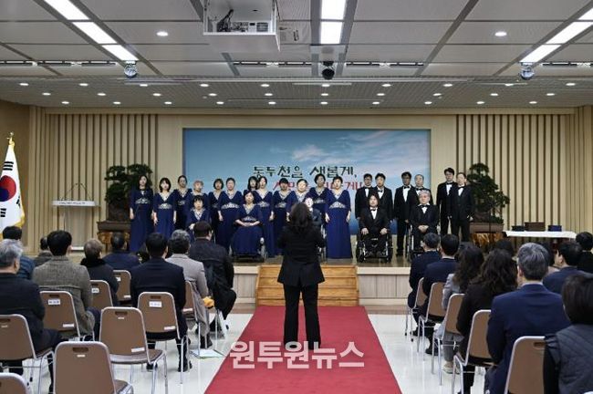 (원투원뉴스) 동두천시 장애인복지회합창단‘별들의 하모니’는 지난 2일, 동두천시청에서 열린 2월 월례조회 식전공연에서 아름다운 하모니로 깊은 감동을 전했다.