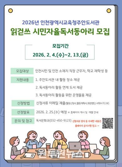 (원투원뉴스) 인천광역시교육청주안도서관은 지역주민의 자발적 독서문화 확산을 위하여 2월 4일부터‘2026년 읽걷쓰 시민자율독서동아리’를 모집한다.