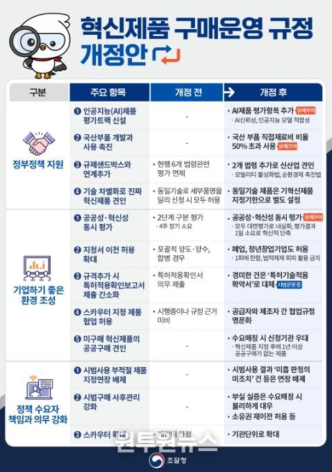 (원투원뉴스) 조달청은 공공분야 혁신조달을 확대하여 우리 경제의 혁신 성장을 견인하기 위해 '혁신제품 구매 운영 규정'을 개정하여 2월 3일부터 시행한다.
