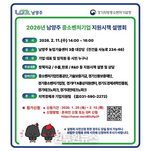 아울러 시는 당일 ‘2026년 남양주시 중소기업 지원시책’ 종합안내서도 배부해 설명회 이후에도 참고할 수 있도록 할 계획이다.