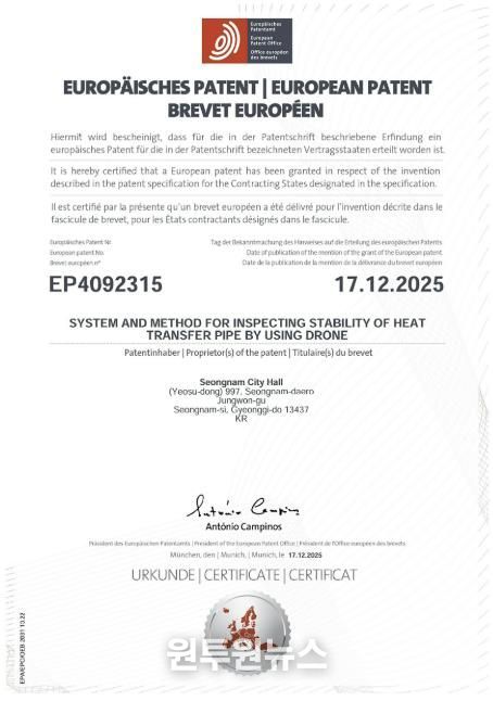 (원투원뉴스) 성남시가 자체 개발한 ‘드론을 이용한 열수송관 안정성 검사 시스템’이 유럽특허(등록번호 EP4092315) 등록을 완료했다고 밝혔다. 이는 시 최초의 해외특허 등록 사례로, 지식재산의 해외 권리화를 통해 유럽 수출길을 여는 계기가 될 것으로 기대된다.