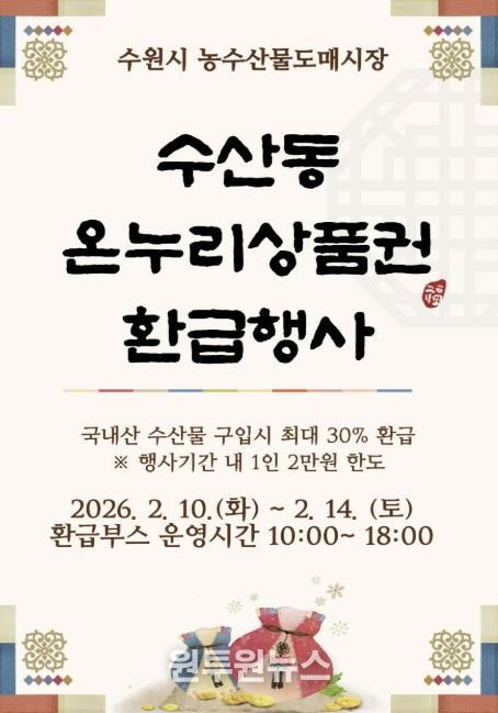 (원투원뉴스) 수원시농수산물도매시장 수산동이 설을 맞아 2월 10일부터 14일까지 온누리상품권 환급 행사를 연다.