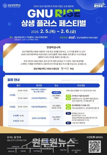 (원투원뉴스) 경상국립대학교 라이즈(RISE) 사업단(단장 황세운)은 2월 5~6일 가좌캠퍼스 GNU 컨벤션센터 대강당 일원에서 RISE사업의 1차 연도 성과발표회 및 기업지원정책 설명회 ‘GNU RISE 상생 플러스 페스티벌’을 개최한다.