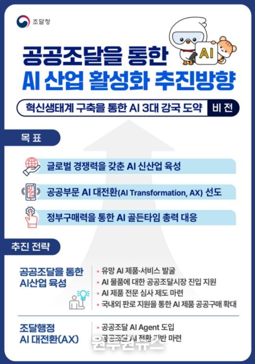 (원투원뉴스) 조달청은 4일 경제장관회의를 통해 '공공조달을 통한 AI 산업 활성화 선도 방안'을 관계부처 합동으로 발표했다.
