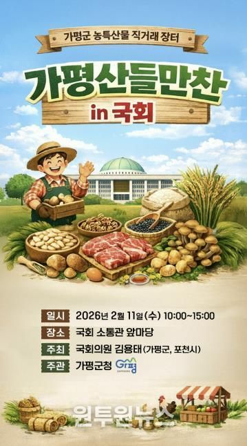가평군은 오는 11일 오전 10시부터 오후 3시까지 국회 소통관 앞마당에서 ‘가평산들만찬마켓 in 국회’ 농특산물 직거래 장터를 개최한다고 밝혔다. 이번 행사는 김용태 국회의원실이 주최하고 가평군이 주관한다.