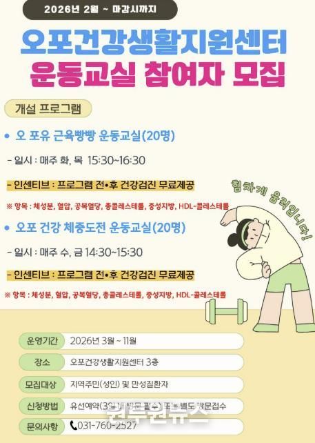참여를 희망하는 시민은 오포건강생활지원센터로 전화 예약 후 3일 이내 방문 접수하거나 직접 방문해 신청하면 된다.