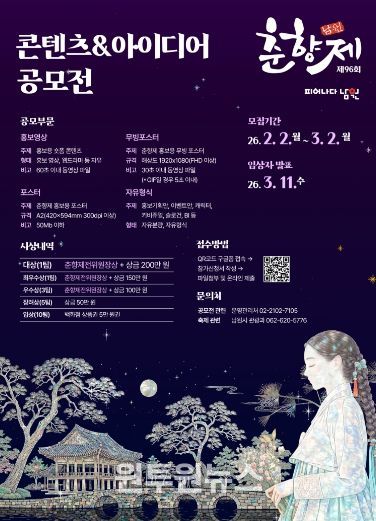 이번 공모전은 오는 2월 2일부터 3월 2일까지 한 달간 진행되며, 수상자에게는 총 1,000만 원 규모의 상금과 함께 남원춘향제전위원장상이 수여된다.
