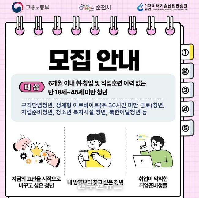 모집 기간은 2026년 상시 운영이며, 자세한 사항은 순천시청 누리집 또는 청년정책114 홈페이지를 참고하거나 청년정책과 청년일자리팀, 사단법인 미래기술산업진흥원으로 문의하면 된다.