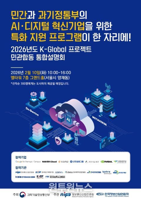 (원투원뉴스) 과학기술정보통신부는 인공지능·디지털 혁신기업의 성장을 지원하기 위한 과기정통부 지원사업들을 한자리에서 설명하는 '한국형 국제 사업(K-글로벌 프로젝트) 민·관 합동 통합설명회'를 2월 10일 오전 10시부터 서울 양재 엘타워에서 개최한다.