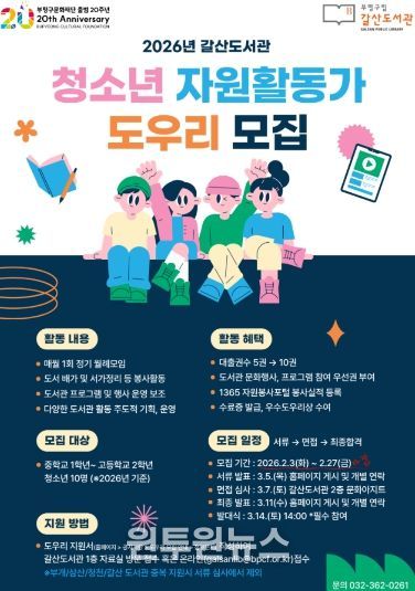 (원투원뉴스) 부평구립 갈산도서관은 오는 27일까지 청소년 자원활동가 ‘도우리’를 모집한다고 밝혔다.