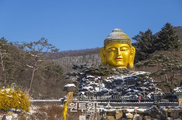 와우정사는 사방이 산으로 둘러싸인 사찰이다. 그럼에도 주차장과 사찰이 바로 연결되어 있어서 산속 사찰치고는 접근성이 매우 좋다. 눈이 내린 날에도 부담 없이 방문할 수 있는 곳이다. 사찰 입구에 들어서면 가장 먼저 눈에 띄는 건 황금빛 부처님 얼굴, 대형 불두(佛頭)다. 황금빛 불두의 높이는 무려 8m다. 전통 사찰에서는 거의 보기 어려운 풍경이 신비롭지만 아직 놀라기에는 이르다. 불두를 뒤로하고 언덕을 오르자면 좌측으로 여러 개의 돌탑이 세워져 있는데 이 모습 또한 매우 독특하다. 돌을 쌓아서 만든 탑이라기보다는 돌을 붙여서 세운 탑처럼 보인다. 사용한 돌의 모양도 둥글둥글해서 이색적이지만 방향 역시 탑의 형태에 따라 가로와 세로로 쌓아 하나의 예술작품처럼 보인다. 언덕을 오르다 보면 네팔 사원을 그대로 옮겨 놓은 듯한 전각도 보인다. 그리고 언덕 정상에는 황금빛 지붕의 건물 하나가 있는데 이곳에 12m 길이의 와불이 모셔져 있다. 인도네시아에서 가져온 통 향나무를 깎아서 만든 이 부처님은 은은한 빛을 받으며 누워 있는 모습이 매우 신비로운 분위기를 만든다.