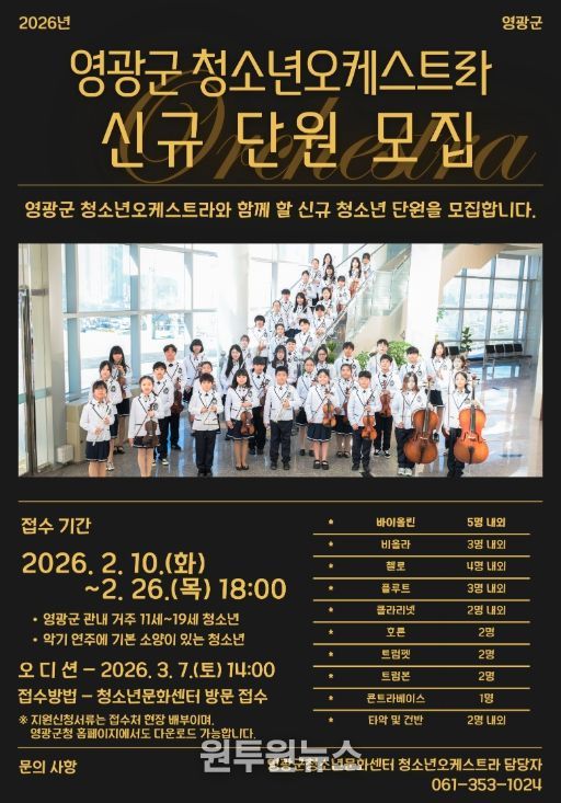 (원투원뉴스) 영광군은 지역 청소년들의 문화예술 역량 강화와 건전한 성장을 지원하기 위해 ‘2026년 영광군 청소년오케스트라 신규 단원’을 모집한다고 밝혔다.
