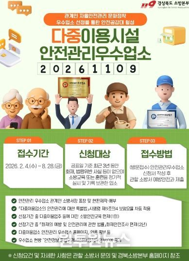 (원투원뉴스) 경상북도소방본부는 자율안전관리 문화 정착을 위한 ‘다중이용업소 안전관리 우수업소’ 신규 신청을 오는 8월 28일까지 접수한다고 밝혔다.