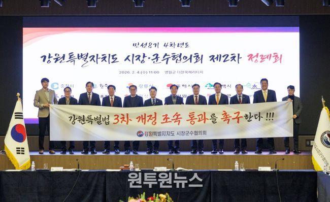 (원투원뉴스) 강원특별자치도시장군수협의회는 2026년 2월 4일 오전 11시, 영월군 ‘더 한옥헤리티지 영빈관’에서 민선8기 4차년도 제2차 정례회를 개최하고 각 시·군의 주요 현안에 대하여 심의하고 대응책을 논의했다.