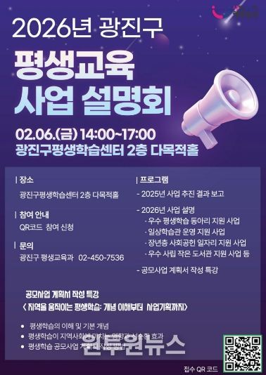 (원투원뉴스) 광진구가 오는 2월 6일 오후 2시 광진구 평생학습센터(자양로15길 60)에서 ‘2026년 광진구 평생교육사업 설명회’를 개최한다.