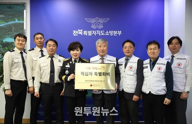 (원투원뉴스) 전북특별자치도소방본부는 4일 도청에서 대한적십자사 전북지사에 2026년도 대한적십자사 특별회비 300만원을 전달했다.