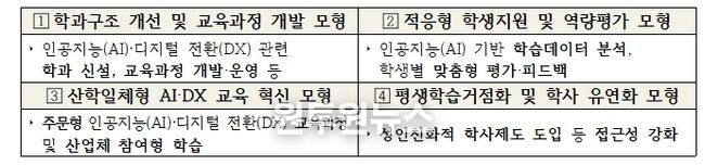 각 참여 대학은 지역 산업과 대학별 강점을 결합한 ‘인공지능(AI)·디지털 전환(DX) 특화 모형’을 구축한다. 대학별로 ▲학과구조 개선, ▲데이터 기반 학생 지원, ▲산학협력 교육, ▲학사제도 유연화 등 필요한 모형을 자유롭게 선택할 수 있다. 또한, 경진대회·공모전 개최로 우수 사례를 발굴·공유하면서, 전문대학 전반의 인공지능(AI)·디지털 전환(DX)을 이끌어갈 계획이다.
