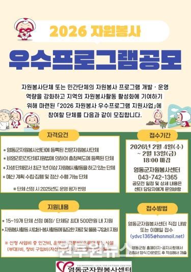 (원투원뉴스) 충북 영동군은 자원봉사단체와 민간단체의 자원봉사 프로그램 개발·운영 역량을 강화하고 지역 자원봉사 활성화를 도모하기 위해 ‘2026년 자원봉사 우수프로그램 지원사업’에 참여할 단체를 모집한다.