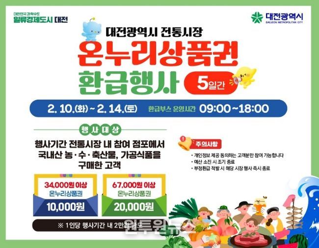 (원투원뉴스) 대전시는 10일부터 14일까지 총 5일 동안 설 연휴 소비 활성화와 지역경제를 살리기 위해 농림축산식품부, 해양수산부와 함께‘전통시장 온누리상품권 환급행사’를 진행한다.