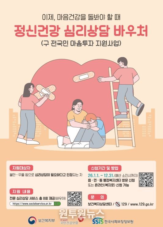 (원투원뉴스) 옥천군은 우울·불안 등 정서적 어려움을 겪고 있는 주민에게 전문적인 심리상담 서비스를 제공하는‘심리상담 바우처 지원사업(구 전국민 마음투자 지원사업)’ 대상자를 모집한다고 밝혔다.