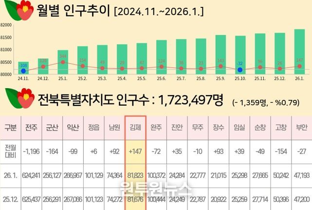행정안전부 주민등록 인구통계에 따르면 2026년 1월 말 기준 김제시의 주민등록인구는 81,823명으로 전월 대비 147명이 증가했다.