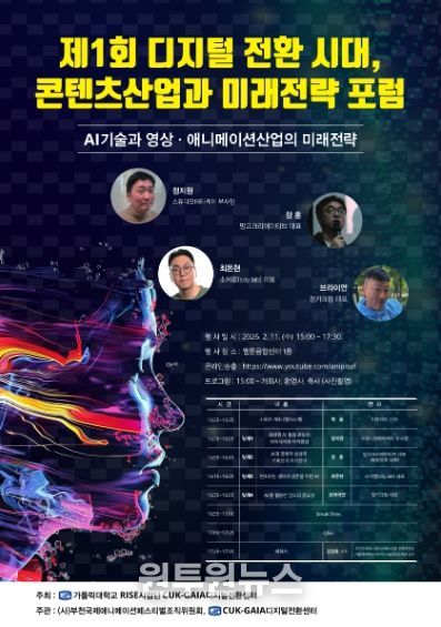 (원투원뉴스) 제28회 부천국제애니메이션페스티벌은 가톨릭대학교 RISE사업단 CUK-GAIA디지털전환센터가 주최하고, BIAF와 CUK-GAIA디지털전환센터가 공동 주관하는 『디지털전환시대, 콘텐츠산업과 미래전략』 포럼을 오는 2월 11일 개최한다.