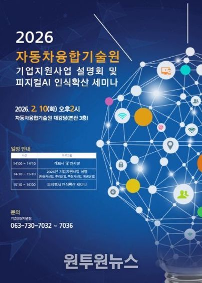 (원투원뉴스) 전북특별자치도는 도내 자동차·뿌리·특장·항공산업 등 주력산업의 경쟁력 강화를 위해 오는 10일 자동차융합기술원에서 ‘2026년 기업지원사업 설명회 및 피지컬AI 산업 인식확산 세미나’를 개최한다고 5일 밝혔다.