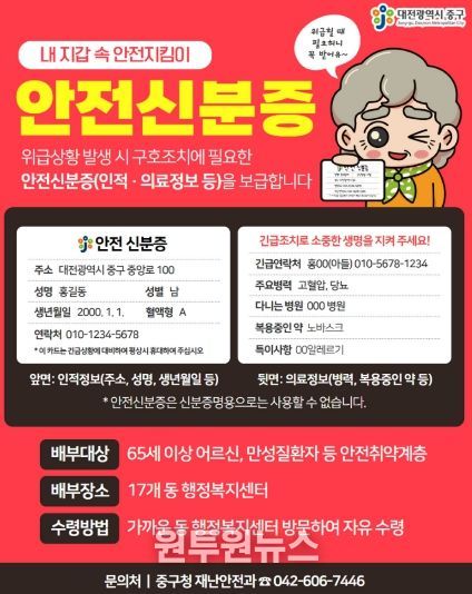 (원투원뉴스) 대전 중구는 위급상황 발생 시 신속한 구호조치를 돕기 위해 의료정보 등을 기재할 수 있는‘안전신분증’을 제작하여 각 동 행정복지센터를 통해 배부한다고 5일 밝혔다.