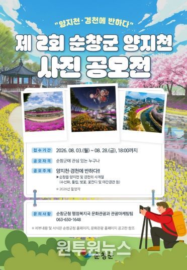 이번 공모전은 순창읍을 흐르는 양지천과 경천의 사계절 풍경과 감성적인 경관을 주제로, 사진을 통해 순창의 매력을 새롭게 조명하고 향후 관광 홍보 콘텐츠로 활용하기 위해 마련됐다.